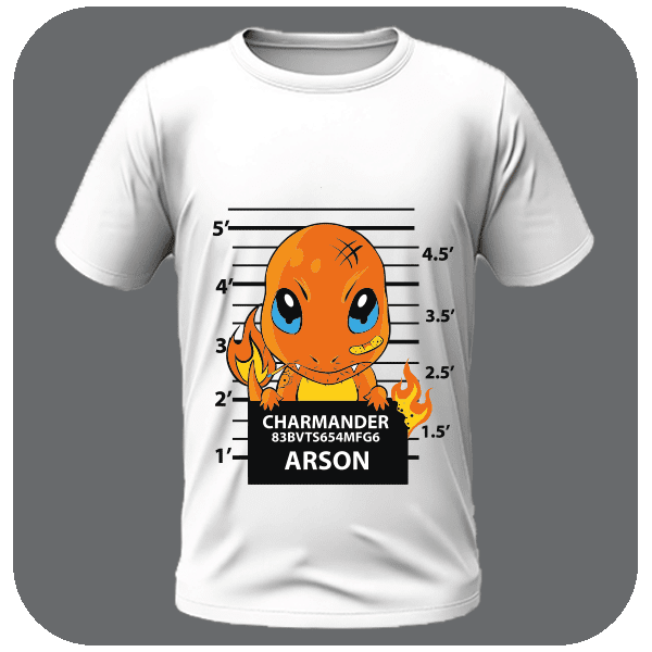 Humorystyczna koszulka z Charmanderem w stylu mugshot, złapanym za podpalanie! Dodaj szczyptę zabawy do swojego stylu i pokaż swoją miłość do Pokémonów w niebanalny sposób.