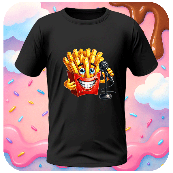 Koszulka Frytki Showman to śmieszna koszulka z frytkami i mikrofonem, koszulka z nadrukiem jedzenia, tshirt dla fanów fast food.