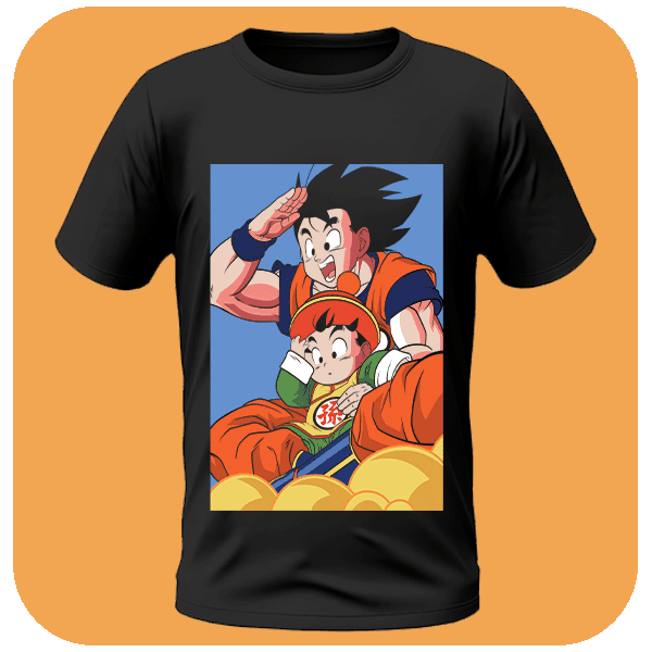Koszulka z dynamicznym nadrukiem Goku i Gohana na latającej chmurce. Idealna dla fanów Dragon Ball Z i klasycznych postaci anime.