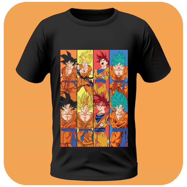 Odkryj wszystkie formy Goku na jednej koszulce. Od formy podstawowej po Super Saiyan Blue. Must-have dla fanów Dragon Ball Z