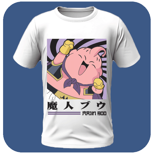 Koszulka z Grubym Bubu z Dragon Ball Z w stylu bootleg. Idealna dla fanów anime szukających nietypowych i zabawnych wzorów. Wyróżnij się z tłumu z unikalnym designem