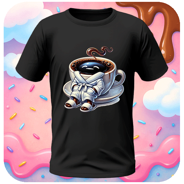 Koszulka Kawa Oczy Zaspane to koszulka z kubkiem kawy, tshirt z oczami i szlafrokiem, idealna koszulka dla kawoszy i leniuchów.