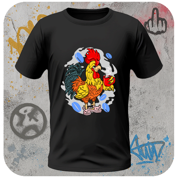Koszulka Streetwear Kogut z Kawą Koszulka z zabawnym nadrukiem koguta z kubkiem w dłoni. Koszulka urban style z humorem. Koszulka z nadrukiem lifestyle chill.