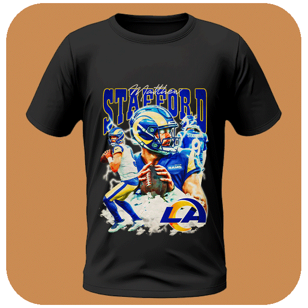 Koszulka Bootleg Matthew Stafford Koszulka z Matthew Staffordem dla fanów NFL, Los Angeles Rams i super bowlowych rozgrywających. Koszulka Sportowa Bootleg. Koszulka z nadrukiem. Koszulka Football.