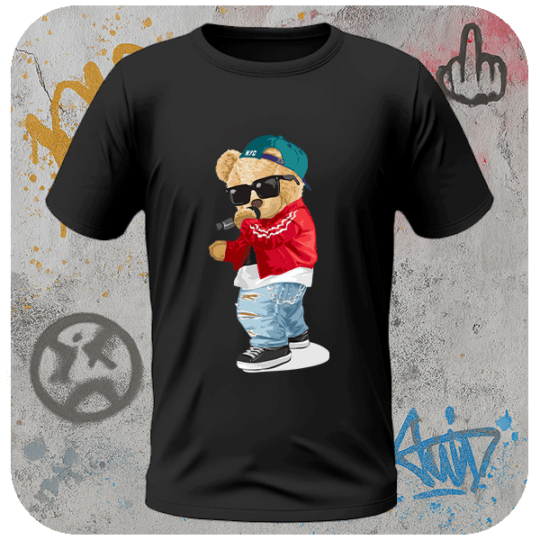 Koszulka Streetwear Miś Raper NYC Koszulka z misiem w stylu rap i nowojorski vibe. Koszulka z nadrukiem streetwearowym. Koszulka dla fanów kultury hip-hop.