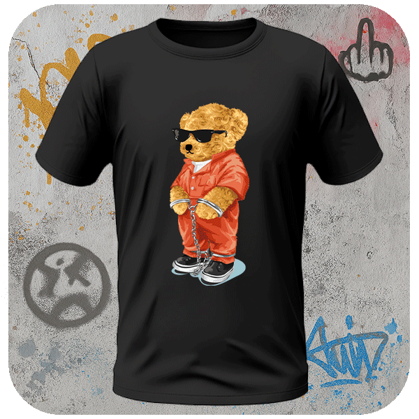 Koszulka Streetwear Miś w Więzieniu Koszulka z kontrowersyjnym nadrukiem w stylu urban. Koszulka z grafiką mocnego przekazu. Koszulka streetwear z bekowym vibe’em.