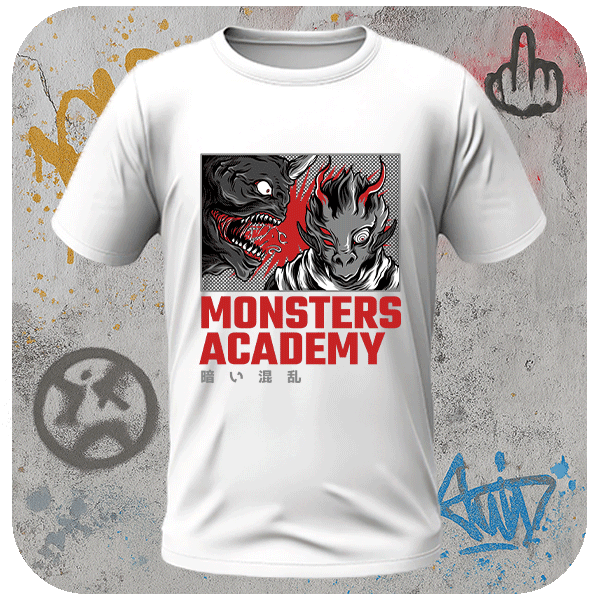 Koszulka Streetwear Monsters Academy Koszulka z potworami w kreskówkowym stylu ulicznym. Koszulka z nadrukiem popkulturowym. Koszulka urban dla fanów animacji.