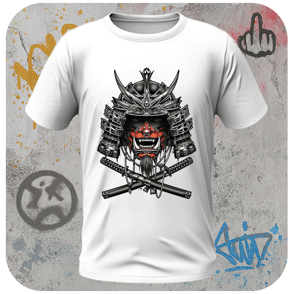 Koszulka Streetwear Samuraj z Maską Oni Koszulka z japońskim wojownikiem w demonicznej masce. Koszulka z nadrukiem street urban. Koszulka manga i warrior vibe.