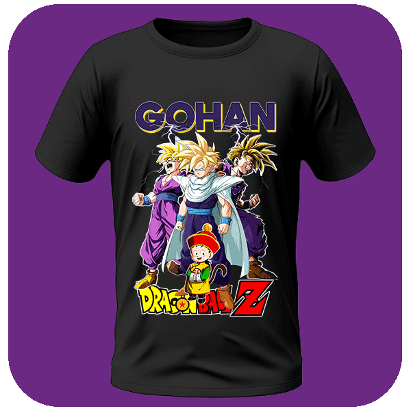 Koszulka z Gohanem w jego najsilniejszych formach z Dragon Ball Z! Wyraź swoją pasję do anime z tym niesamowitym nadrukiem przedstawiającym ewolucję bohatera.