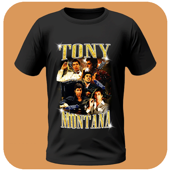 Koszulka Bootleg Tony Montana. Koszulka z Tonym Montaną z kultowego filmu Scarface z Al Pacino. Koszulka Gangsterska Bootleg. Koszulka z nadrukiem. Koszulka Filmowa.