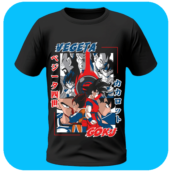 Koszulka z Goku i Vegetą, dwoma najbardziej legendarnymi postaciami z Dragon Ball Z. Niezbędnik w kolekcji każdego fana.