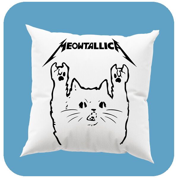 Poduszka Meowtallica. Śmieszna poduszka dekoracyjna Meowtallica dla miłośników kotów i muzyki rockowej. Świetny dodatek do salonu lub sypialni dla fanów oryginalnych i zabawnych akcentów.