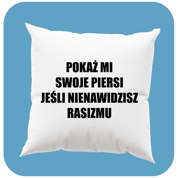 Poduszka Pokaż mi swoje piersi. Odważna poduszka z napisem Pokaż mi swoje piersi jeśli nienawidzisz rasizmu. Przyciągająca wzrok dekoracja dla osób ceniących humor i bezpośrednie przesłanie.